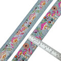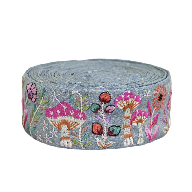 インド刺繍リボン50cm切り売り キノコの森B ブルー 5cm幅 花 HC マッシュルーム ベニテングタケ R-0838