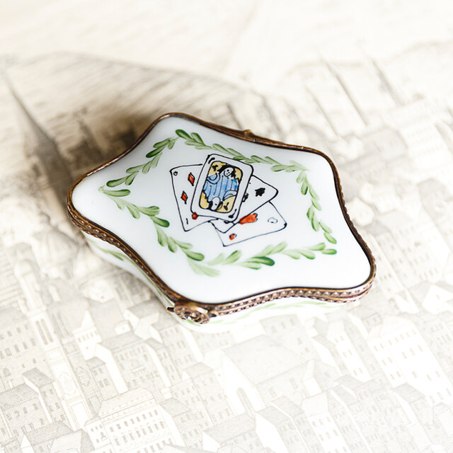 トランプが描かれた陶器のトリンケットボックスです。