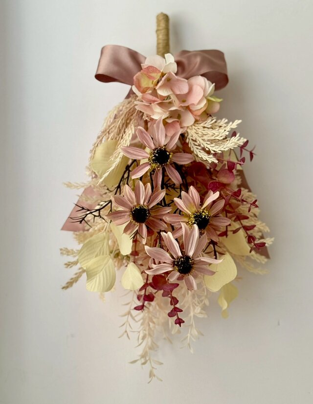 くすみ系ピンクのルドベキアにパンパスやドライ風ユーカリ