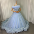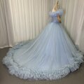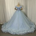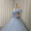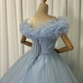 カラードレス ブルー 取り外しオフショルダー キラキラチュール フレアスカート 華やかなトレーン 編み上げ 披露宴