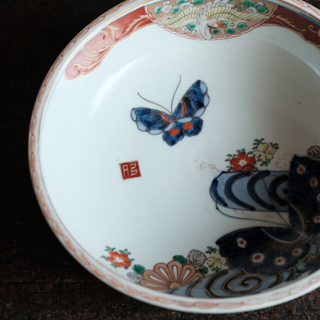 花と鶴と蝶々◆伊万里 花蝶文赤絵金彩浅型大鉢 碗 骨董・antiques 器 暮らしに 明治期 大