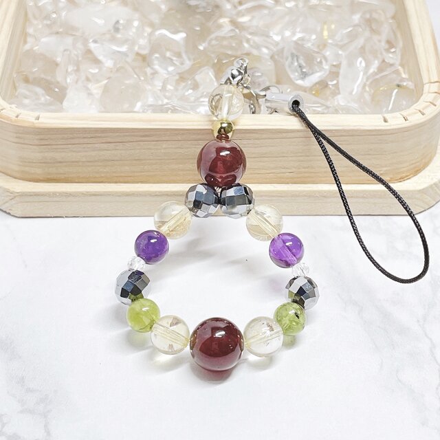 疲れた心に元気を取り戻す|オレンジガーネット・シトリン・アメジスト・ペリドット /パワーストーンストラップ No843S