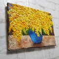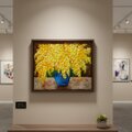 本作品では、背景の落ち着いた茶色と花瓶の鮮やかな青色とのコントラストが絶妙で、ミモザの明るさや活力を一層引き立てています。温かみのある丸く可愛らしい小花が枝垂れるように描かれ、作品全体からは温もりや希望、幸福感が伝わってきます。見るだけで心が軽やかになり、日常に元気をもたらしてくれるでしょう。