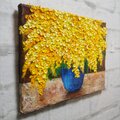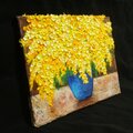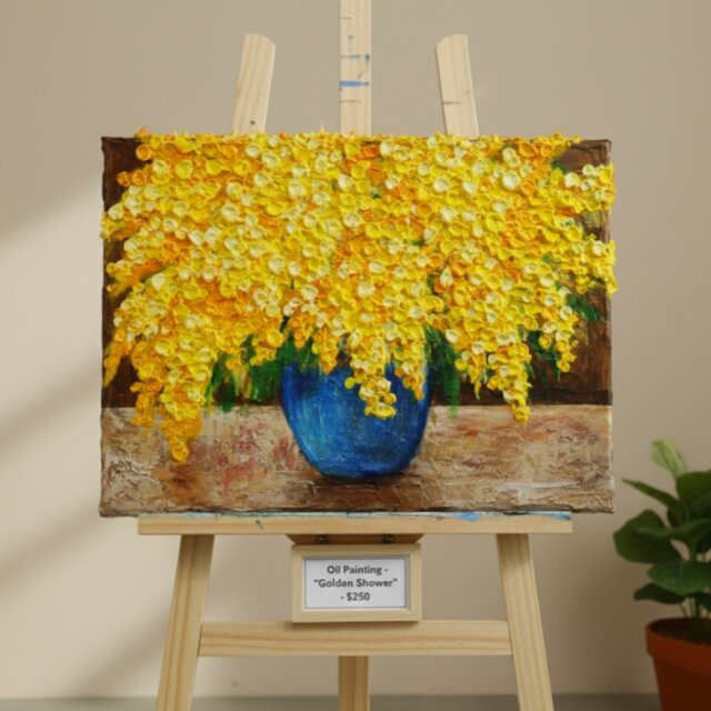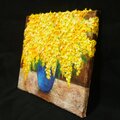 「癒しのミモザ」は、生命力あふれる黄色い花が特徴的な特別な油絵です。サイズは横333mm×縦242mmで、まるで本物のミモザがその場にあるかのような、豊かな立体感と躍動感が表現されています。厚塗り技法による絵の具のテクスチャーが、花びら一つひとつを盛り上げ、見る者を魅了します。