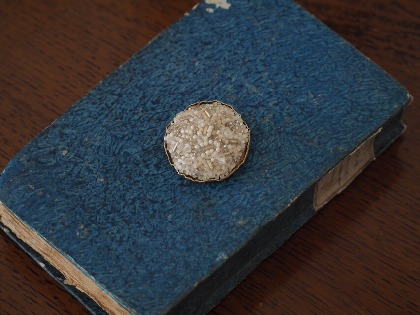 あの夜の突然の訪問者、霰を小さなブローチにしてみました。フランスの白いアンティークビーズと小粒のハーキマーダイヤモンド、銀色のタケビーズ、極小のチェコシルバービーズを使いました。