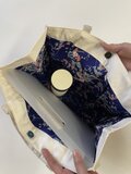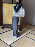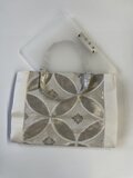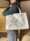 帯の柄の美しさを活かしてバッグを作りたいと思いました。人目を引きつける、存在感ある美しさのバッグです。A4サイズのファイルや水筒も余裕で入る大きさで、中に底板を入れました。汚れ防止のため底には底鋲を打ってあります。内部は着物地を使っており、マグネットホック、ポケット、Dカンをつけました。取っ手にも角カンを使っているので、カラビナやナスカンを取り付けることもできます。