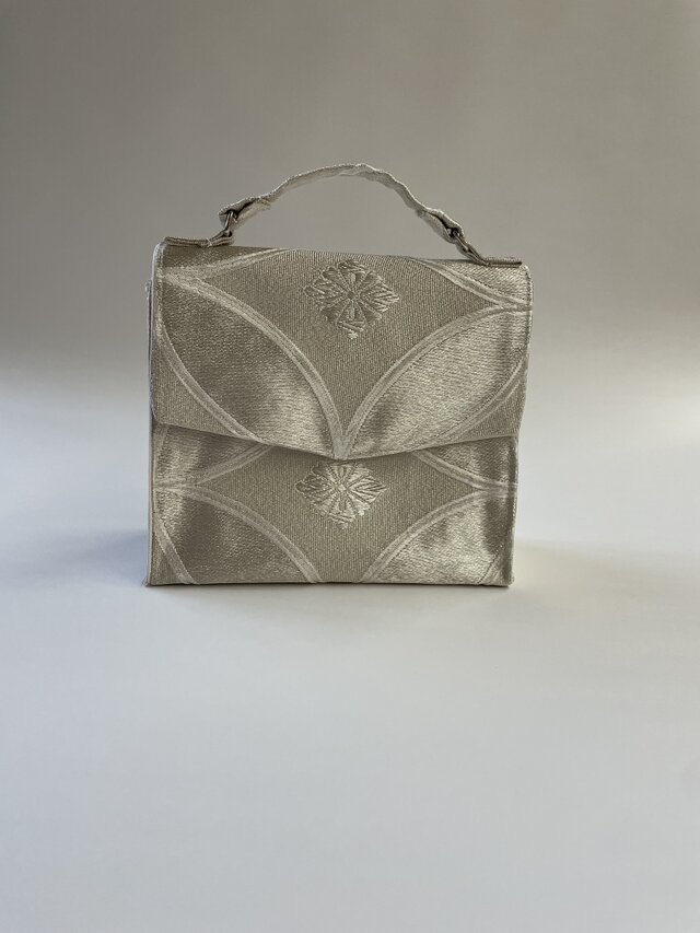 小型のハンドバッグです。帯で作っているので、きものや成人式の振袖と合わせるのも素敵です。もちろん洋服と合わせても。中は帯の芯地を使いました。ポケットとマグネットホックをつけてあります。