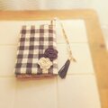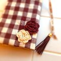 茶色のチェックの生地に白と茶色のお花を丁寧に縫い付けました。