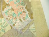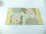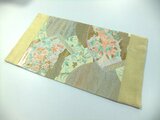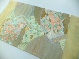 銀糸地に扇小花文様です。両端は他の帯の金糸中無地(絹)を使用しました。品のいい色合いで高級感のある帯地です。