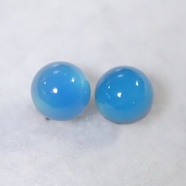 半透明の鮮やかなブルーが美しい、ブルーカルセドニーのカボションを、シンプルかつ存在感のあるスタッドピアスに仕立てました。