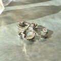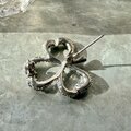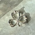 梨地の微細なテクスチャーの華奢なリボンテープを巻きつけたようなデザイン。ラインストーンを配置したリボンスタイルの三つ葉クローバーで、さりげないデザインのこわだわりを感じさせます。