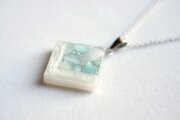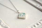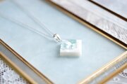 透明のレジンにホワイトシェルと静謐さを感じさせるアクアマリンに着色されたシェルを沈め、光沢のあるホワイトで囲ったペンダント。