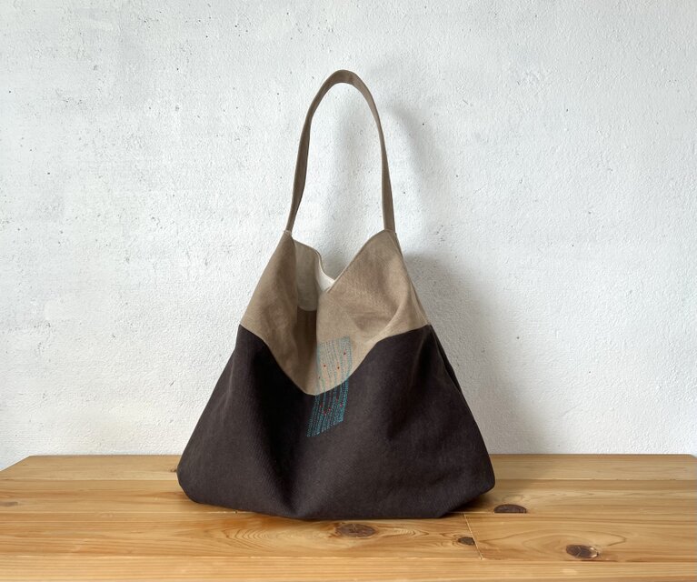 3色の綿糸でのステッチが とっても丁寧に 刺してあり 美しいデザインに! ヌメ革の持ち手が 個性的でインパクトあり 経年変化が 楽しみ。 コンパクトに くったりなるので 使い勝手が良い。