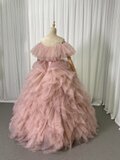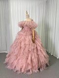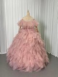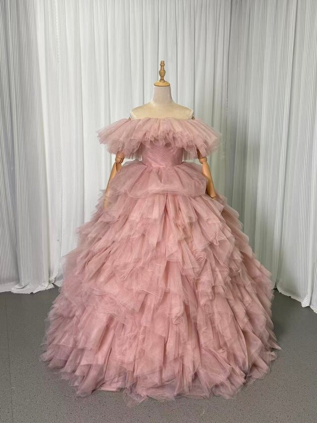 人気上昇!薄桃色 カラードレス 取り外しオフショルダー 柔らかく重ねたチュールスカート ロング 編み上げ 前撮り