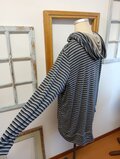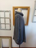 グレーと紺のボーダーで、透かし編みのポリエステル、アクリルのニット素材。透けないように内側にコットンカットソーで2枚合わせで安心して着やすくふわっとあたたかいです。前と後ろ身頃と袖、フードがニットとコットン裏地の2枚合わせです。