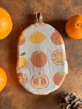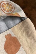 ミカンはたくさん種類もあり、楽しませてくれます。そんなおミカンを並べました。ベンガラ泥染めで染めた生地を使っています。