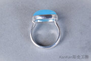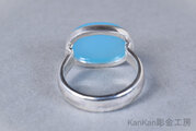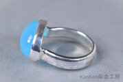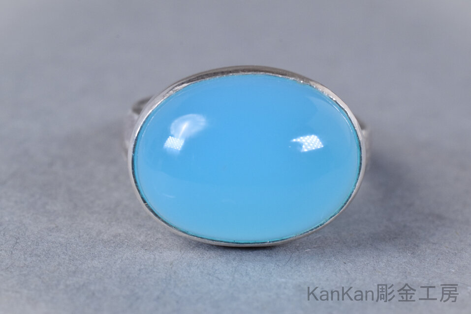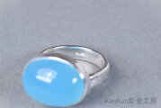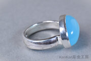 ボリュームのあるシーブルーカルセドニーを覆輪留めに仕立てました。甲丸に仕立てたリングの腕部分は幅がありますので男性にもお勧めできます。