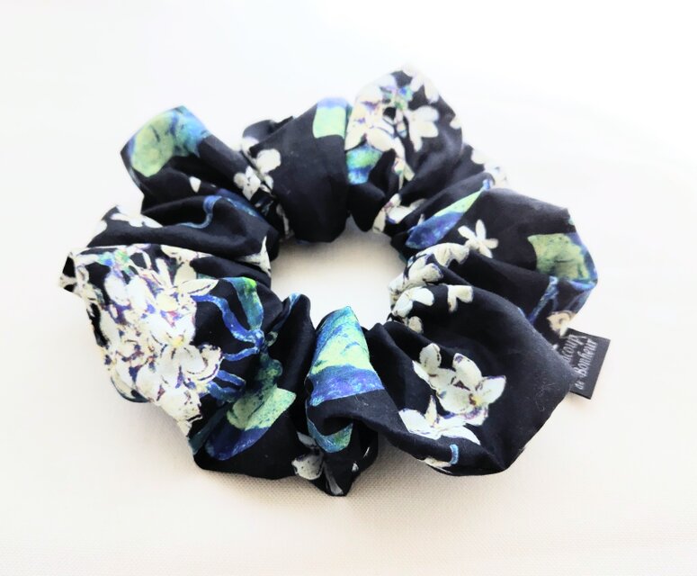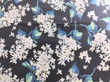 リバティのアーカイブライラック柄ブラック地にオフホワイト色の花柄、軽くて柔らかい綿タナローン地を使っています。