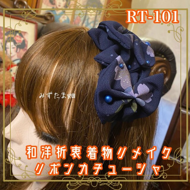 【着物リメイク ハンドメイド おりぼん ティアラ ヘッドドレス カチューム カチューシャ ヘアアクセサリー 和洋折衷 レトロ 和ロリータ 紺青の静寂 × 瑠璃パールの魔法 RT-101】