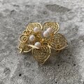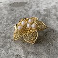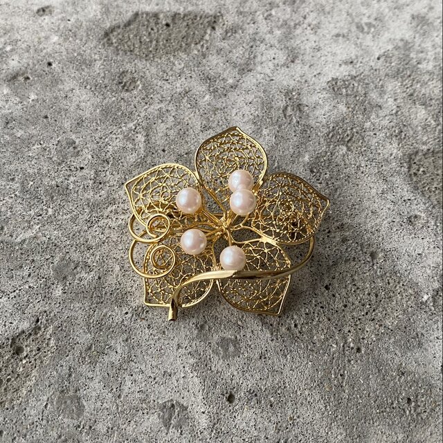 軽やかなフィリグリーの花びらが素敵なUSAヴィンテージブローチ。華やかな雰囲気の中央のパールもポイント。存在感がありジャケットやストール等のアクセントにおすすめです。