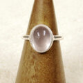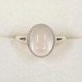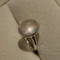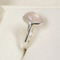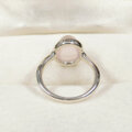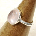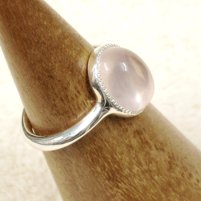 ぷっくりしたローズクォーツをふくりん留めした指輪です。ローズクォーツの柔らかな雰囲に合います様に、石の周りにはミル打ちを行って枠の輝きを和らげました。