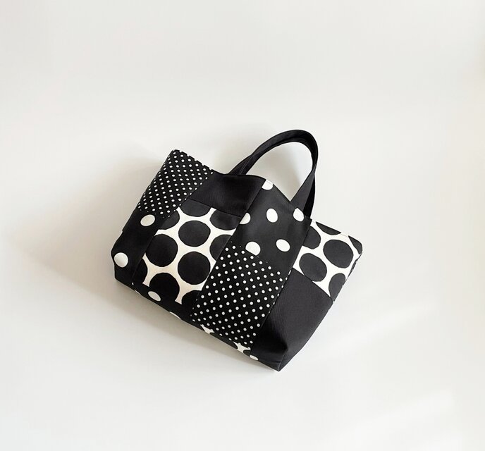 一点物|黒白ドット パッチワークトートバッグ|A4対応・マチ付き