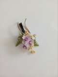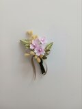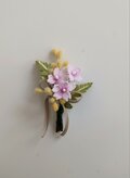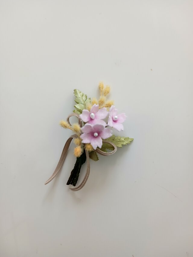 ピンク色に染めたさくらとミモザで花束にし、ベージュベルベットリボンを結び、小さな可愛いコサージュに仕上げました。