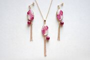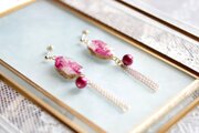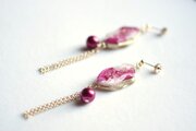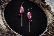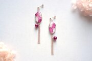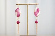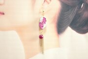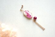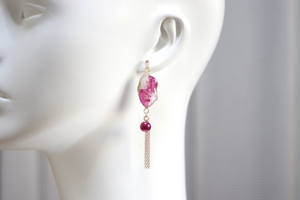 スライスアゲートのような光沢のある白いレジンにピンクの模様を描き、ガラスパールとフリンジを添えたピアス。