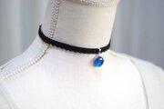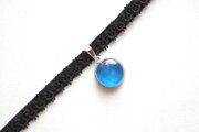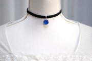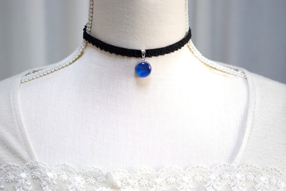 真冬の夜空を思わせる深く鮮やかなブルーと、煌めく星のようなラメの輝きが美しいレジンを、ベルベットリボンにタティングレースで装飾を施したチョーカーに仕上げました。