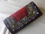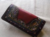 ヌメ革を刻印やカッターでクラフトして拭き染めを施したロングウォレットです。