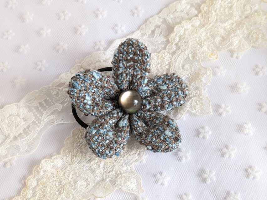 上品なツイード生地で仕立てたお花モチーフのヘアゴムです。