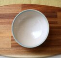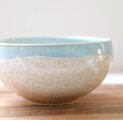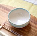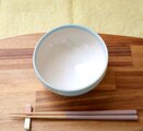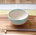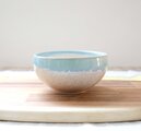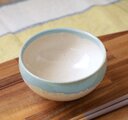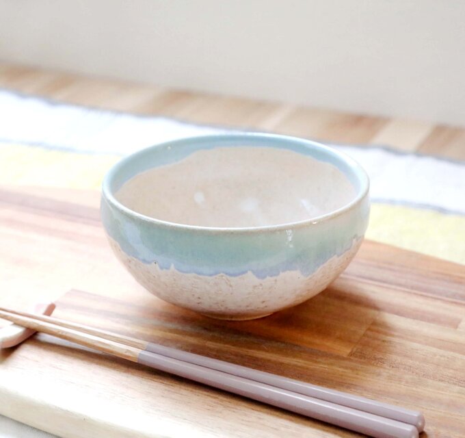 丸みを帯びたボウルの形に成形し、艶のある白い釉薬と落ち着いたニュアンスブルーの釉薬をかけて焼き上げました。