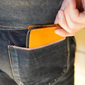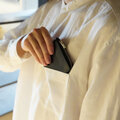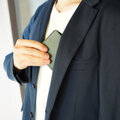 ジャケットの胸ポケットにもすっぽり。ポケットがふくらまずシルエットも崩れないスマート設計。ズボンの前ポケットに入れても邪魔にならず、忘れてしまうくらい薄い。後ろポケットにもすっぽり収まりボッコリふくらまず、ひっかかりなく瞬時に出し入れ。