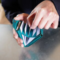 コンパクトサイズなのに、厚手のカード約15枚(カードスロットに5枚、まとめて収納ポケットに5枚ずつ)、3つ折りのお札が約8枚収納可能です。(まとめて収納ポケットの片方を全てお札にすれば、約12枚収納。)レシートも収納可能。