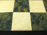 ■帯を繋いでリメイクいたしました。青っぽい部分はおよそ100年前の帯地を使用しています。アイボリーホワイト部分は夏物の帯地を使用しています。交互につないでモダンな雰囲気に仕上げました。
