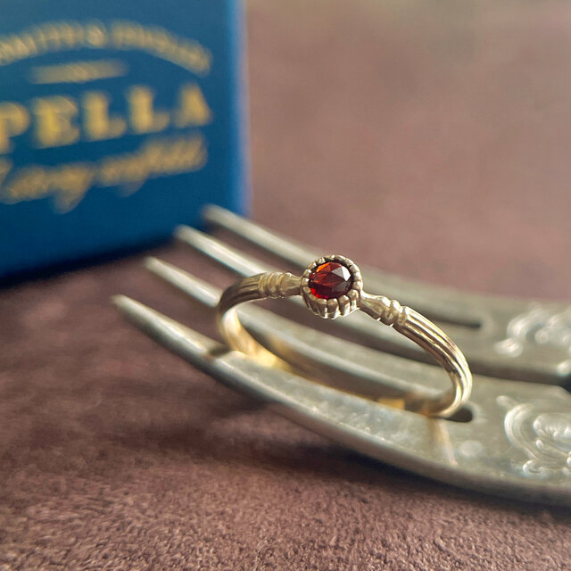 果実のように瑞々しいローズカットの宝石と、カトラリーを思わせる腕のかたちが、そっと指元に馴染みます。