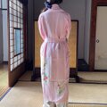 菊の模様のガウンです。なめらかな絹は素肌になじみます。絹は化学繊維と異なり、素肌のうるおいを奪いませんし、静電気が起きにくい特性があります。桜色のようなピンクの洋服を選ぶのに抵抗があるという方でも、ご自宅で、プライベートな時間にならいかがでしょうか。気持ちが華やぐ明るい色です。