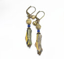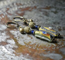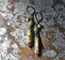 モザイク模様ローマングラスとイブルービーズ、つぶつぶブラス、民族鈴を繋いだピアスです。