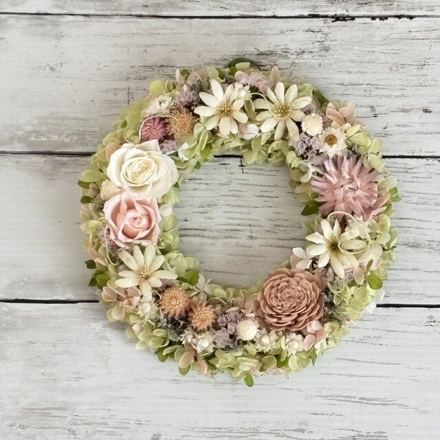 若草カラーのアジサイと合わせた春に飾っていただきたいリースです。
