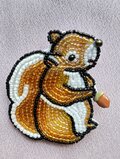 手に持っているのはどんぐりのチャームです。ふわふわのしっぽがかわいいリスです。簡単なラッピングのみ対応します。ちょっとしたプレゼントにいかがですか?