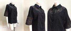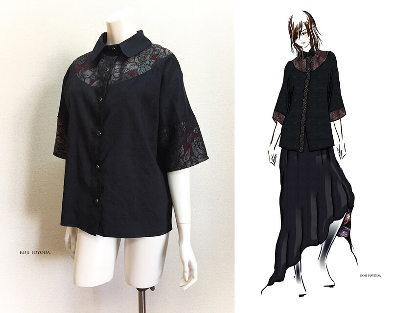 素敵なブラウスが届きました。首元の黒いトリミングがとても効いていると思います。デザイン画のように黒いロングスカートと合わせて、足元はパンプスで気合を入れて。動きやすいのもいいですね。ありがとうございました。
