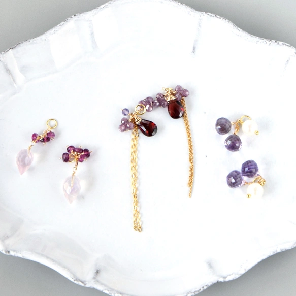 14kgf花雫の余韻 Pink Amethyst / Garnet / Rose Quartz 3種イヤーチャームセット