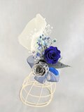 プリザーブドフラワーの青い薔薇とシルバーローズにカラー(カラーのみ造花)を使用したブートニアです。コサージュとしての利用もできます。
