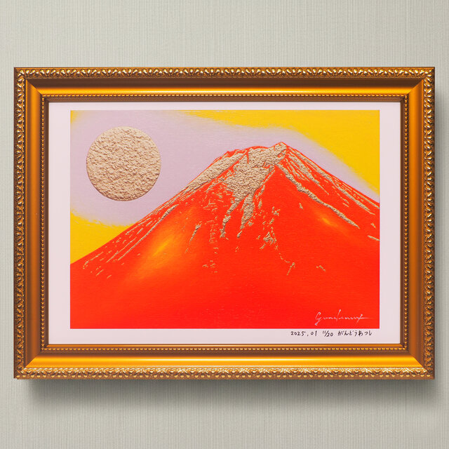 富士山は古来より、長寿や繁栄の象徴とされます。赤富士をモチーフに、明るく力強い印象を大切に制作しました。