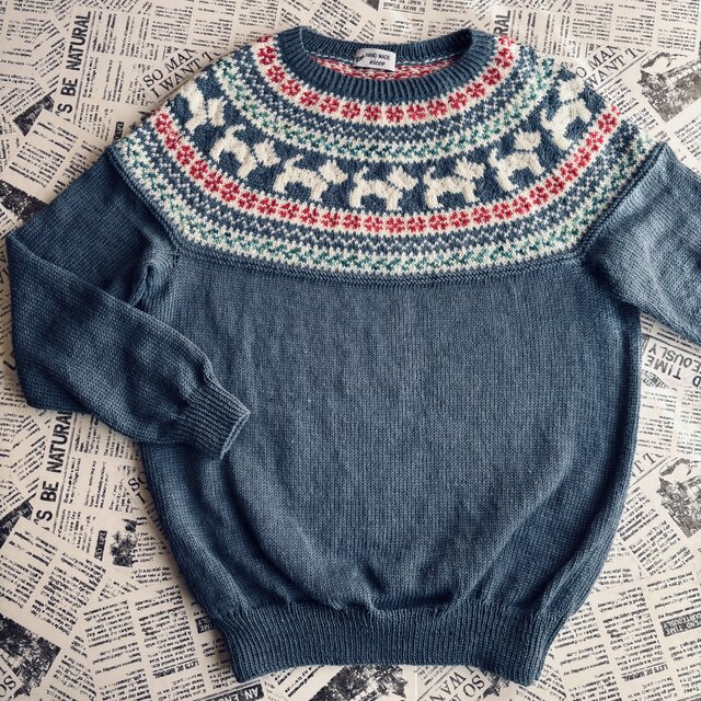 スチールブルーの空の下、ピンクのお花が咲く野原を元気に散歩するテリアをイメージして編み上げた、丸ヨークのセーターです。