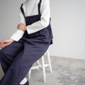 サイドポケットもあり、ファスナー、ボタンでの着脱です。リラックス感あるシルエットですのでラフに着ていただきやすく、様々なインナーと相性がいいです。アウターやカーディガンを羽織ったりするとハイウエストボトムを着ているかのようなバランスになり、着まわしの効くつなぎです。