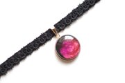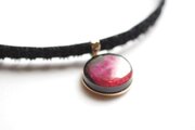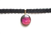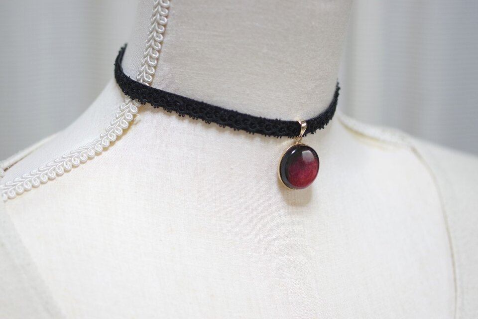 漆黒の背景にルビーレッドが輝くシックでエレガントなレジンを、ベルベットリボンにタティングレースで装飾を施したチョーカーに仕上げました。