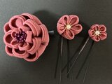 上品な紅色のちりめん生地を使用し、伝統的な技法で一つ一つ丁寧に仕上げた、つまみ細工の髪飾りです。