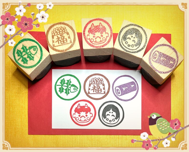 ⌘節分はんこ《5個セット》〓【鬼・オカメ•升まめ•柊鰯•恵方巻】3cm四方