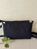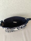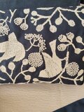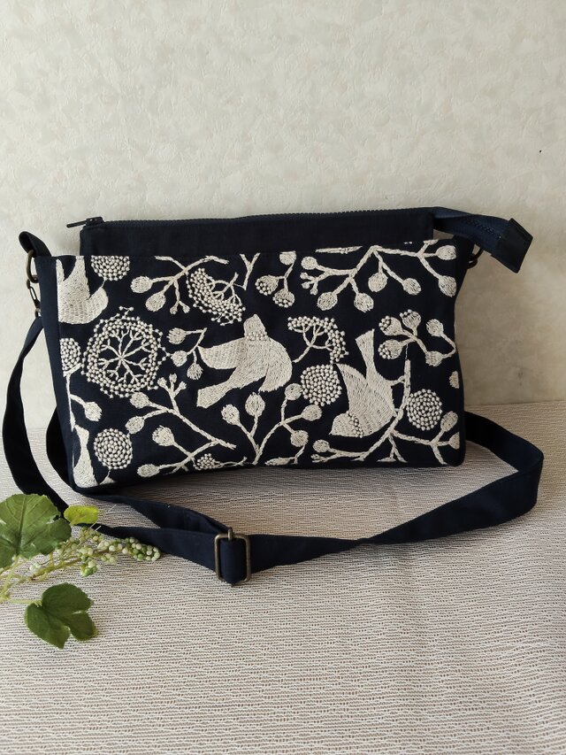 ネイビーに白の小鳥や木々の刺繡が施された重厚感、高級感あふれる素敵な生地で、ショルダーを作製しました。